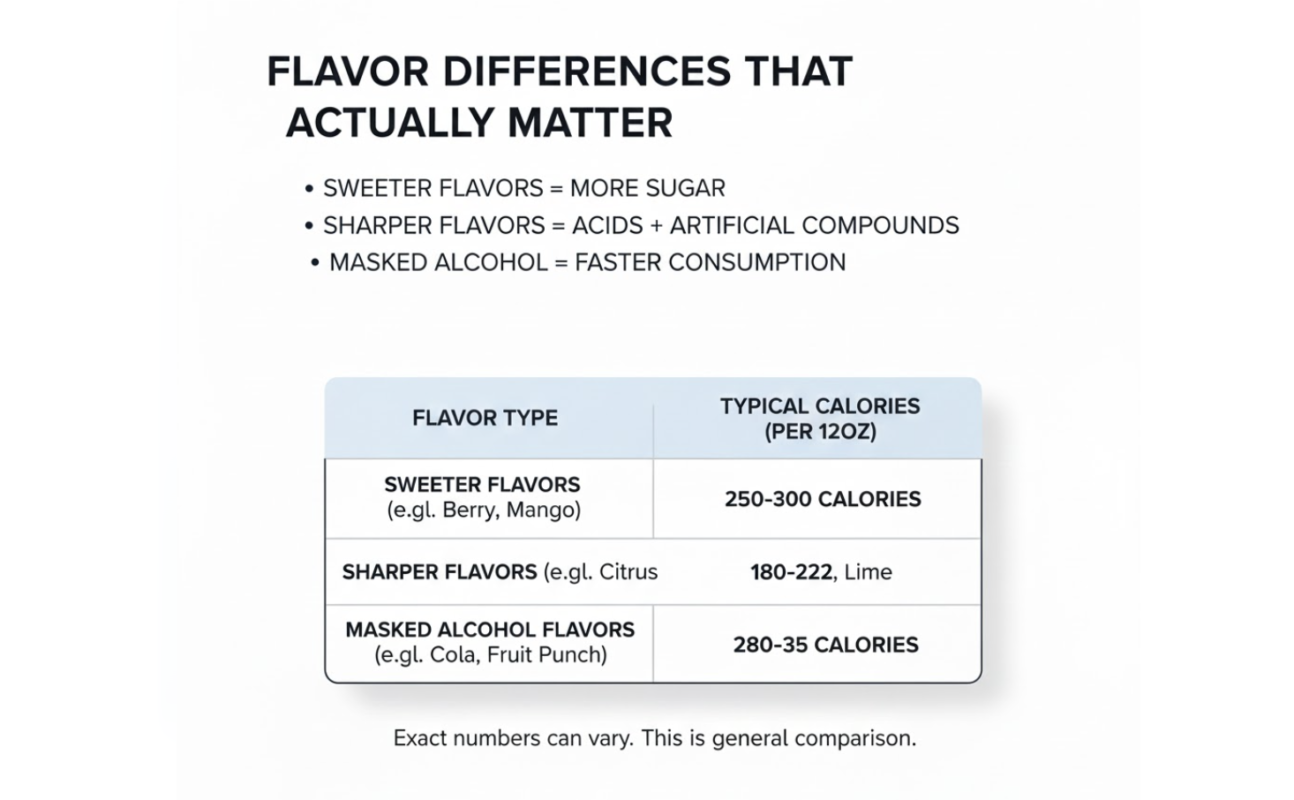 Some flavors mask alcohol better, which can lead to faster consumption. Faster drinking doesn’t change total calories, but it changes how quickly they hit the bloodstream.