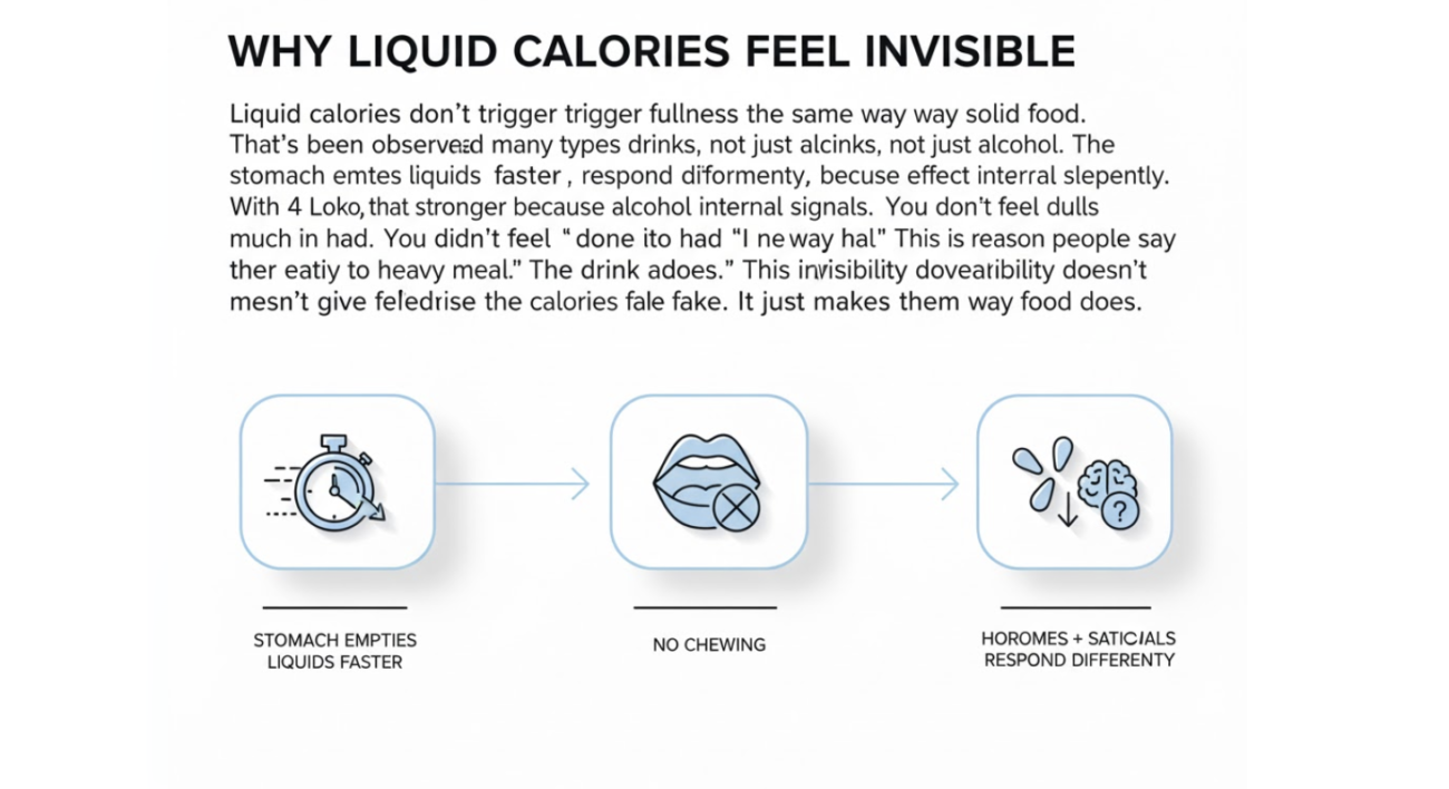 Liquid calories don’t trigger fullness the same way solid food does. That’s been observed across many types of drinks, not just alcohol. The stomach empties liquids faster. Chewing doesn’t happen. Hormones tied to satiety respond differently.