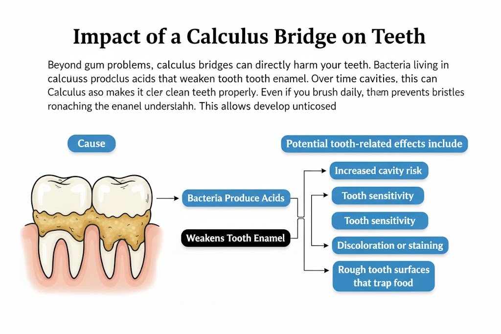 Beyond gum problems, calculus bridges can directly harm your teeth. Bacteria living in calculus produce acids that weaken tooth enamel. Over time, this can increase the risk of cavities.