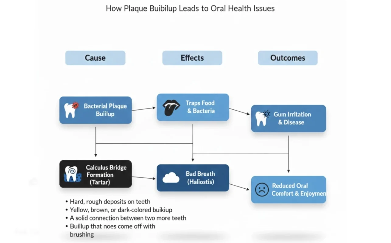 A calculus bridge is more than just hardened plaque. It is a sign that bacteria have had time to build up and attach firmly to your teeth. While it may not cause pain at first, it can lead to gum disease, tooth decay, bad breath, and long-term oral health problems if ignored.