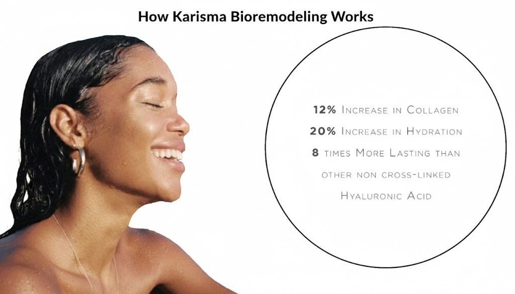 Collagen remodeling is the biological magic behind bioremodeling. As we age, collagen production declines significantly—leading to sagging, wrinkles, and volume loss. Karisma treatments use dynamic compounds such as recombinant collagen and hyaluronic acid, which stimulate fibroblasts, the cells responsible for collagen synthesis.