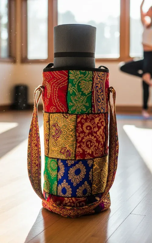 This bag is light strong and easy to carry wherever you go. if you head to the studio the park or a weekend retreat it keeps your essentials organized and your mat protect. The sari fabric is colorful and vibrant giving you a fresh look that is as unique as your yoga journey.