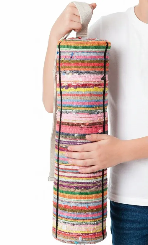 Your yoga mat deserves more than just a simple bag. The Recycled Sari Yoga Mat Bag JadeYoga is handmade in Nepal from recycled cotton saris. Every single bag is different with its own mix of colors and patterns which makes each one truly special. When you carry it you are not just holding your mat but also carrying a story of hope and positive change.